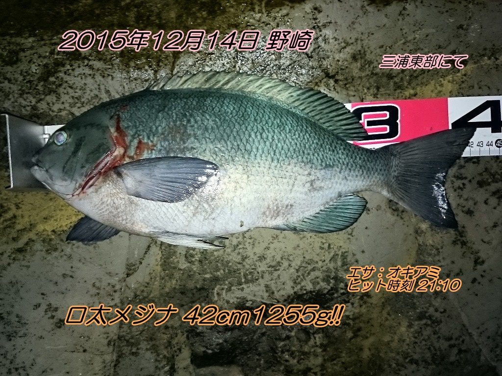 ■コメント:早上がりの月曜日は東部地磯へ出撃!魚全体の活性が高かったです。夕マヅメにはサヨリも接岸し、日中は秋磯の様相でした。日が落ちると型の良いメジナが食ってきました!!一番デカい42cm1255gは潮に乗せて30mほど流したら食ってきました。エサは生オキアミ、ウキ下は2ヒロ(約3m)です。後ほど釣行記を書きます(^^)/
