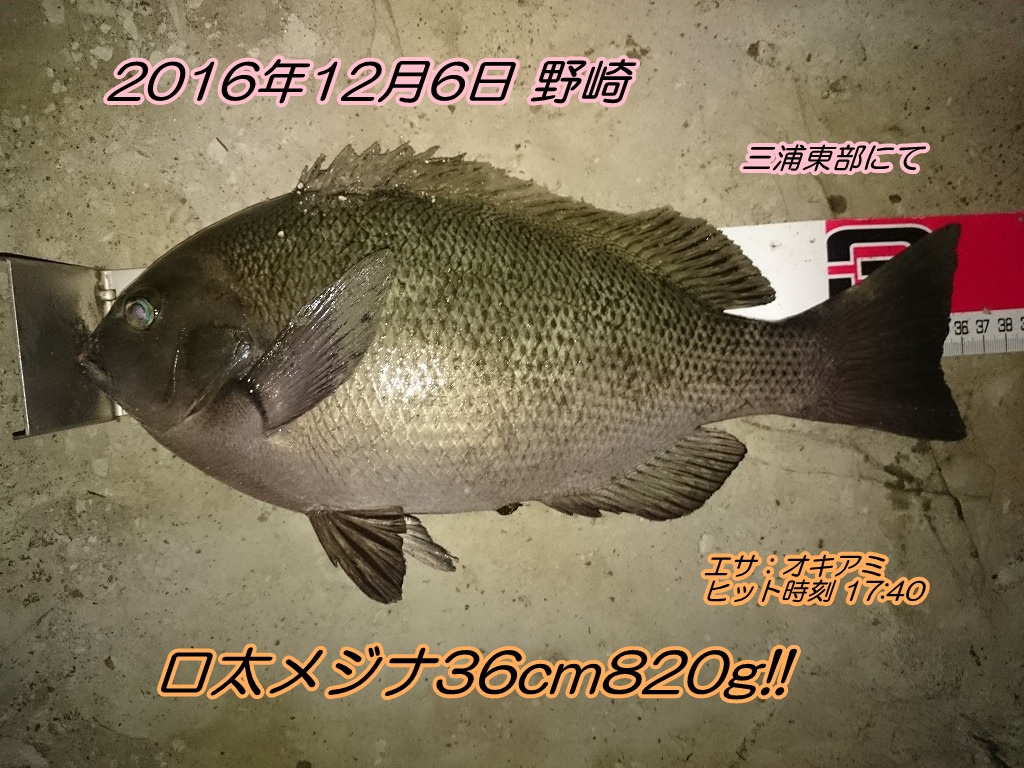 ■コメント:右足がまだ少し痛むため、今回も近場のポイントから竿を出しました。実釣開始の15:10から暫くは付けエサのオキアミが残る展開。『おっ、これはチャンスか!』と意気込むも完全に空回り…。食いはかなり渋かったです。日没後の17:40に釣れた36cm820gの肥えたメジナが唯一の本命釣果でした。身の厚みと体高がある寒メジナ魚体で引きが強かったです!