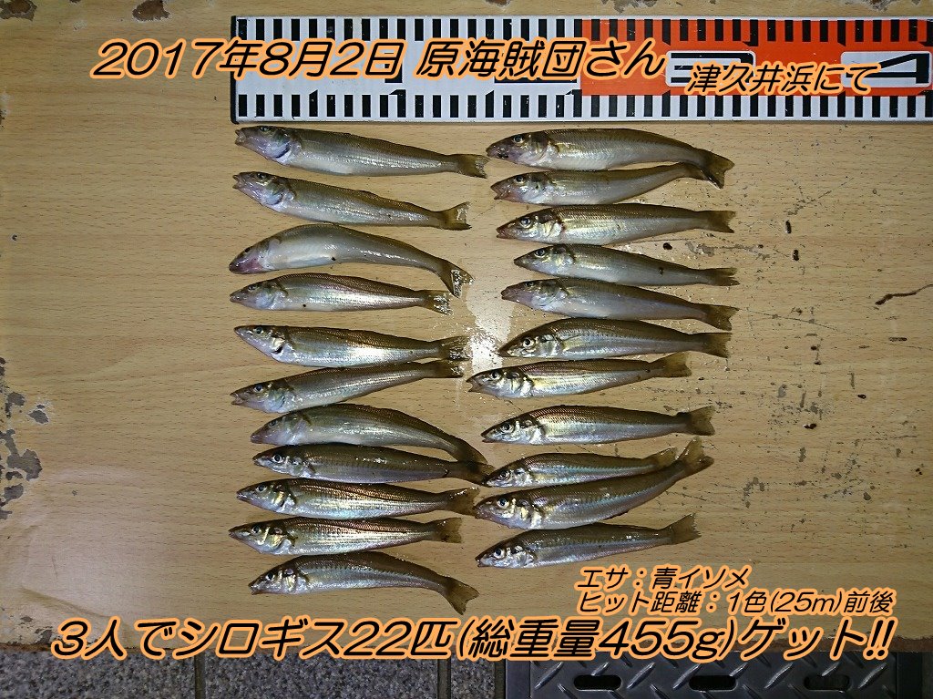 ■コメント:東京から電車釣行の仲良し3人組の原海賊団御一行様がお店正面サーフからのちょい投げで22匹のシロギスをゲットしました。ニュースでも度々報道されたように昨日の三浦半島はゲリラ豪雨に見舞われました。さらに今朝は真夏とは思えない涼しさと北東風。サーフからの投げ釣りには不利な条件が重なりましたが、そんな状況をものともせずシロギスのアタリを捉え続けました。ちょい投げシーズン開幕を思わせる素晴らしい釣果です。おめでとうございます!