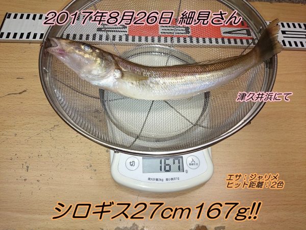 ■コメント:8/26時点で当店の2017年シロギスランキング1位を更新するジャンボシロギスが出ました!27cm167gの大型です!本日唯一の本命釣果が超大物で本当に良かったですね^^おめでとうございます!