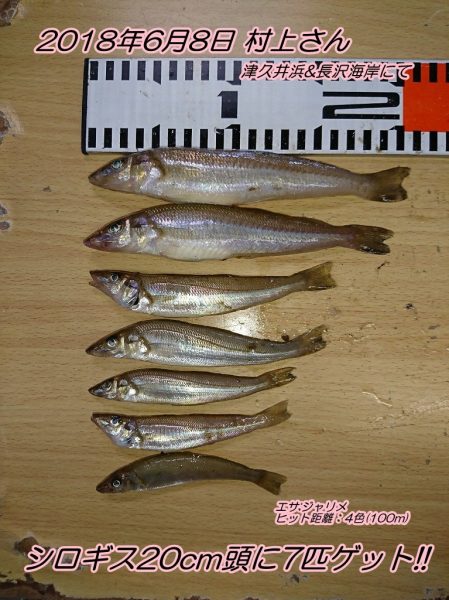 ■コメント:電車釣行の村上さん。徒歩で津久井浜~長沢海岸を攻めて7匹のシロギスをゲットしました。釣りの後はさらにお店までシロギスを持って来てくれました。機動力とシロギスを探す洞察力は流石ですね。おめでとうございます!