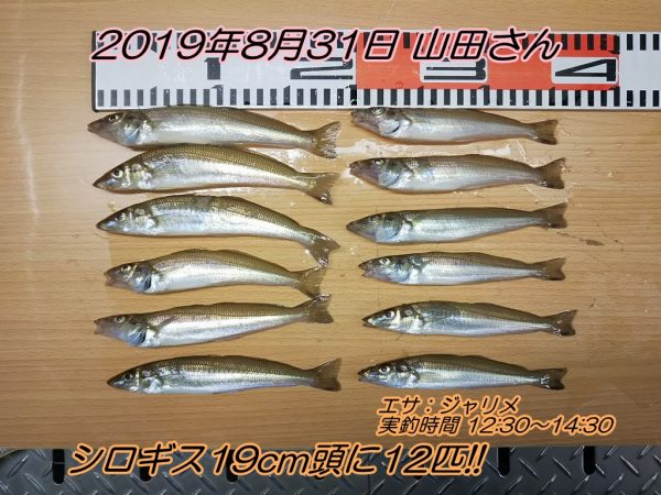 岩場で投げてシロギス12匹! 2019年8月31日 19:12 投げ・堤防釣り ■日付:8月31日 ■天気:晴れ ■潮回り:大潮 ■場所:三浦東部 ■お名前:山田さん ■釣果:シロギス19cm頭に12匹 ■コメント:風裏の小磯(岩場)から砂地を狙って投げた山田さんが、実釣2時間で12匹のシロギスを釣り上げました!『お昼の大潮干潮後の上げ狙いでやってみます。』と出かけて行った山田さんの読みが当たりましたね!おめでとうございます!