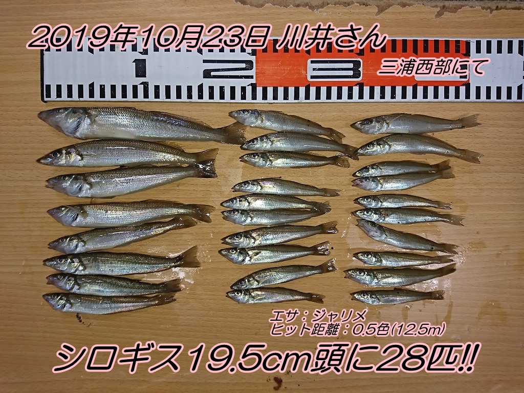 ■コメント:川井さんが19.5cm頭に28匹のシロギスをゲットしました。近距離での引っ手繰るようなシロギスのアタリ。最高ですね。場所の見切りと選択も見事でした。おめでとうございます!