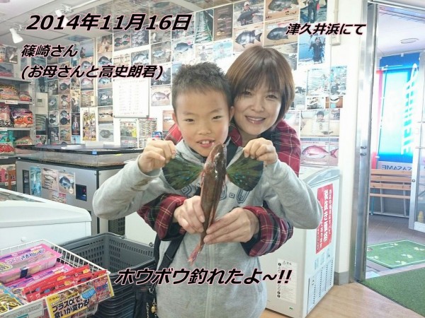 ■コメント:お父さん、お母さん、二人の息子さんの家族4人で投げ釣りを楽しんだ篠崎さん。良型のシロギスはお父さん、ホウボウはお兄ちゃんが釣りました。自宅の水槽で飼うために釣りたかったイイダコとクサフグも釣れてとても満足そうでした。帰りにお母さんと弟の高史朗君がお魚を持ってお店で記念撮影。お二人の笑顔が素敵でした。おめでとうございます!