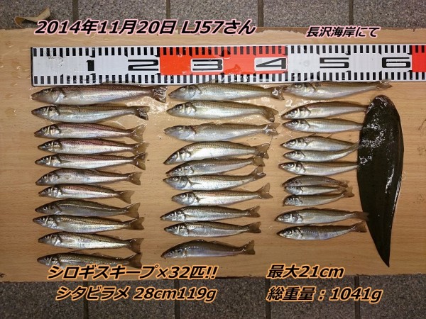 ■コメント:電車釣行の投げ釣り師、LJ57さんからの釣果情報です。やはりキスの群れが濃いところと薄いところがハッキリしていたそうです。群れが小さいのかアタリ自体は単発で3連や4連などの多点掛けも無かったものの、それでも型を揃えてシロギスの総重量を1041gまで伸ばす腕前はさすがですね!1匹平均32.5gオーバーです。おめでとうございます!