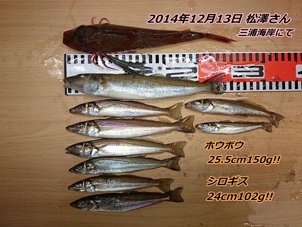 三浦海岸でシロギス24cm頭に9匹! 2014年12月13日 00:00 投げ・堤防釣り ■日付:12月13日■天気:晴れ■潮回り:小潮■場所:三浦海岸■お名前:松澤さん■釣果:シロギス24cm102g(シロギス合計9匹)、ホウボウ25.5cm150g■コメント:久しぶりにまとまったキスの釣果のお持ち込みがありました!今日は昼前から西寄りの強風が吹いたんですが、現場では右後方からの風となり釣りにくくは無かったそうです。ヒット距離は5色~6色、エサは青イソメです。この時期の24cm102gのキスの釣果は貴重ですよね!おめでとうございます!