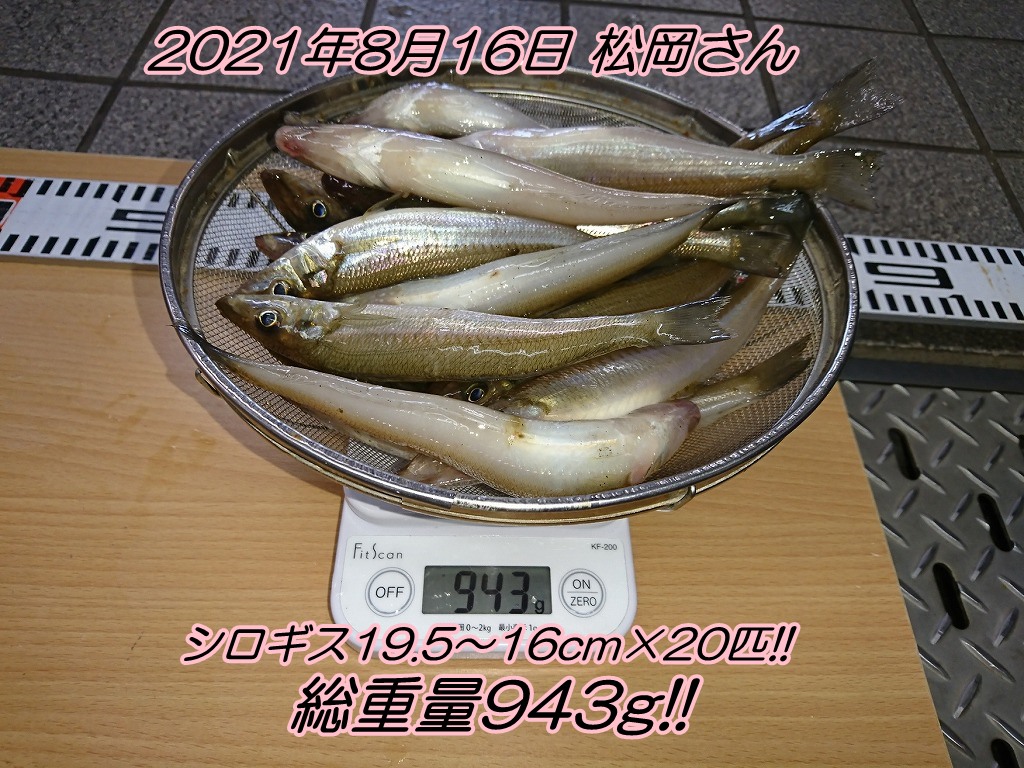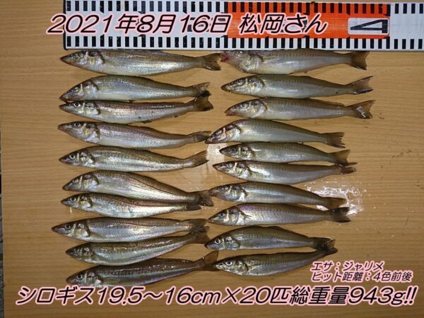 ■コメント:早朝からお昼前まで投げた松岡さんが19.5~16cmのシロギスを20匹ゲットしました。総重量は943g。19~18cmのお腹が膨らんだ個体がほとんどで1匹平均47.1gの型揃いでした。このサイズがズラリと並ぶと見栄えがしますね。雨の中頑張った甲斐がありましたね。おめでとうございます!