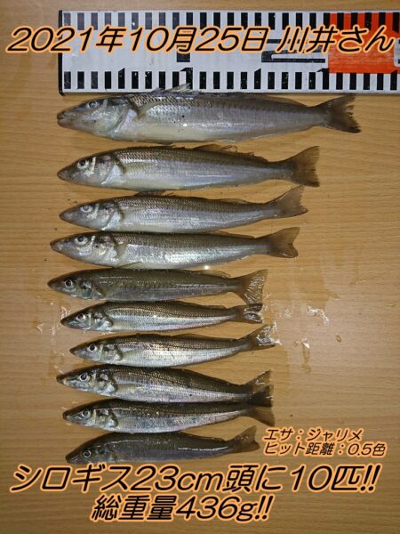 ■コメント:毎週コンスタントにシロギスを釣り上ている川井さん。今日も得意のポイントで23cm頭に10匹のシロギスをゲットしました。10匹で総重量は436g。23cmは別格ですが、その他のサイズもまずまずですね。おめでとうございます!