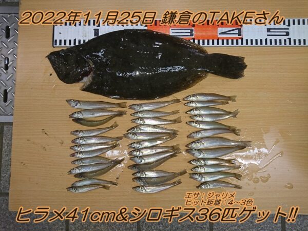 ■コメント:朝から投げ釣りに出掛けた鎌倉のTAKEさん。開始直後からシロギスは好調。そんな中、シロギスのアタリの直後に一瞬重くなる手応えを感じました。『何だろう?』と次の投入。再度同じような手応えがあり、今度は針掛かり成功!キス仕掛けでのギリギリの攻防戦を制し、砂浜にずり上げたのは41cmのヒラメでした。ヒット時刻はAM7:30頃です。