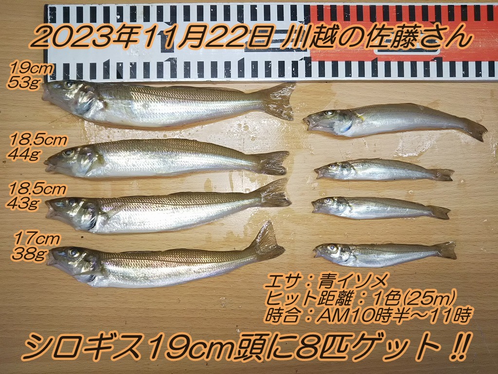 ■コメント:電車釣行の川越の佐藤さんが良型シロギスを携えて凱旋帰店♪ 早速釣果を検量すると、19cm53g筆頭にヒネクラス4匹を含む8匹のシロギスが並びました!!