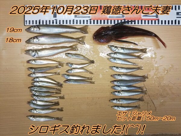 午前11時の実釣開始直後、一投目でホウボウがヒット!その後も波打ち際から50m~20mの近距離で19cm、18cmの良型まじりでシロギスのアタリをキャッチできたそうです。