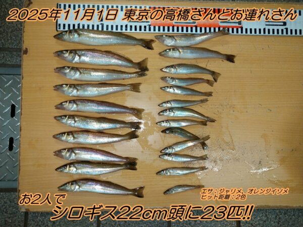 ■コメント:AM9時過ぎ~お昼過ぎまで竿を出した高橋さんが釣行後にお店に立ち寄ってくれました。写真左の列は22cm、20cmなど良型が揃って10匹合計474gでした。約4時間半の実釣でこれだけ釣れれば十分ですね。お連れさんも大変満足されたようで良かったですね。おめでとうございます!