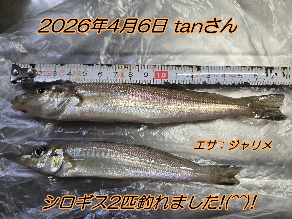 ■コメント:4/3にシロギス8匹の好釣果を出したtanさんにご投稿いただきました♪同じポイントに入るも、今日はお魚さんの活性が低かった模様。しかし遠投作戦で本命シロギスを2匹キャッチ!!おめでとうございます!