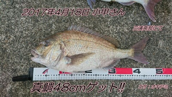 ■コメント:風裏・波裏の釣り場で竿を出した小甲さんが乗っ込み態勢に入った真鯛を3枚ゲット!!沖狙いに変更し、良型魚のアタリを引き出しました。前回は西部エリアの新場所にチャレンジし、雨の中で50cmの年無クロダイを仕留めています。素晴らしい釣果連発ですね^^おめでとうございます!