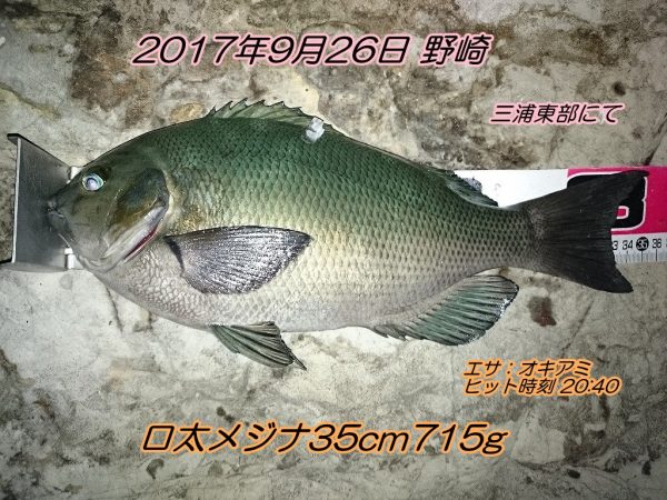 ■コメント:昨日午後から21過ぎまで地磯で竿を出しました!真っ暗になる間際にデカいサヨリが2匹ヒット!同じくマアジも連続ヒット!アジの最大は24cm。塩焼き~アジフライにもってこいのサイズでしたよ~。メジナの最大は35cm715g。納竿少し前にヒットしました。