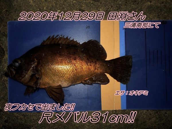 ■コメント:2020年の釣り納めに出掛けた田淵さんからメールが届きました。日中のメジナは32cmまでと大物は不発でしたが、日没後は夜の帝王の真価を発揮。余裕の尺越え・31cmのメバルを釣り上げました。メバル狙いの釣り人には憧れの尺メバル。三浦では難易度がとても高いです。大アジもいいお土産になりましたね。おめでとうございます!