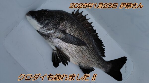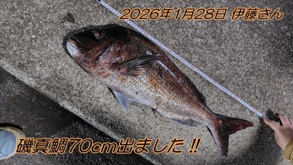■コメント:1/28(水)、伊藤さんがデカい磯真鯛をゲットしました!!アタリらしいアタリはほぼ皆無という激渋りの状況を打破し、千載一遇のビッグチャンスをつかみ取りました!!