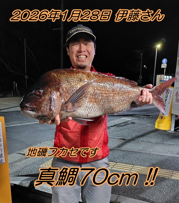 ■コメント:1/28(水)、伊藤さんがデカい磯真鯛をゲットしました!!アタリらしいアタリはほぼ皆無という激渋りの状況を打破し、千載一遇のビッグチャンスをつかみ取りました!!