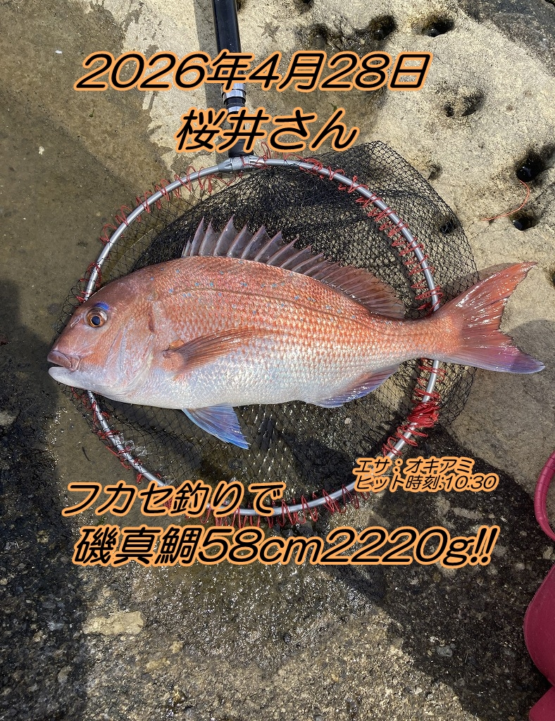 ■コメント:昨日地磯に出掛けた桜井さんが58cm2220gの磯真鯛をゲットしました。魚がヒットするや否や瞬時にメジナではないと判断して冷静に対処したのはこれまで数々の良型魚を仕留めてきた桜井さんの経験値の高さゆえでしょう。さすがでした。ブルーのアイシャドウに鰭をピンピンに伸ばした魚体がとても美しいですね。こんな奇麗な真鯛が突然ヒットするから磯釣りは本当に面白いです。初真鯛ゲット、おめでとうございます!
