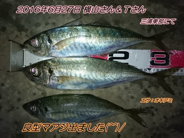 良型マアジ38cm&36cm&31cm! 2016年6月29日 09:39 その他の釣り ■日付:6月27日 ■天気:曇り ■潮回り:小潮 ■場所:三浦東部 ■お名前:横山さん&Tさん ■釣果:マアジ38cm、31cm(横山さん)、36cm(Tさん)■コメント:横山さん、Tさん、野崎の3人でナイトフカセを満喫しました!(^^)! 小サバが出てきて苦戦模様でしたが、横山さんが38cmのでっかいマアジを釣り上げました!エサはオキアミです。夜がメインとなりますが、地磯の浅場にも良型マアジの群れが入ってきたようですね!おめでとうございます!